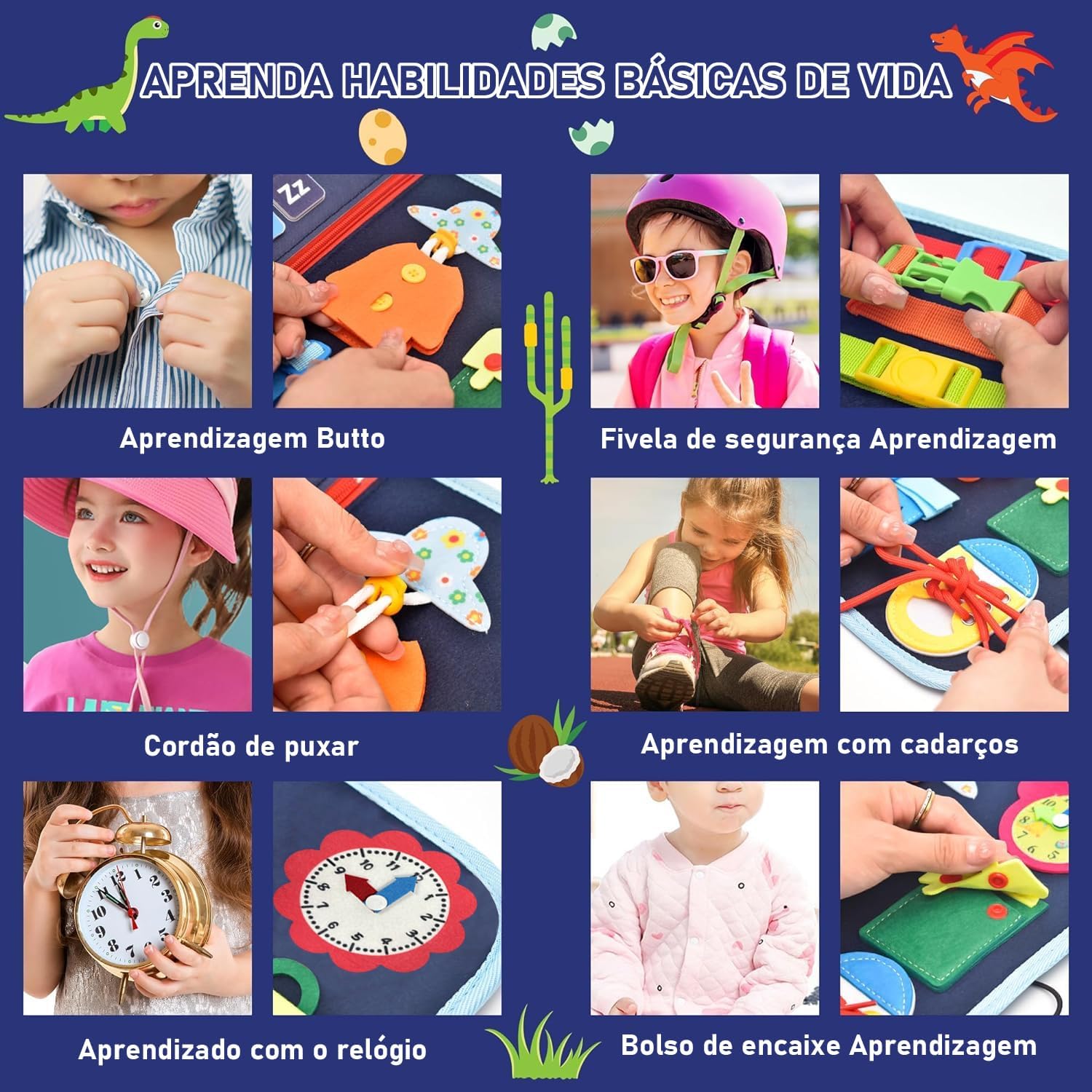 BRINQUE ENQUANTO APRENDE: mantenha o seu bebê entretido enquanto ele desenvolve habilidades essenciais, como vestir-se no seu próprio ritmo, aprimorando as habilidades motoras finas e a destreza dos dedos. A página do relógio e do calendário é para a habilidade cognitiva.A página de combinação de formas e o divertido quebra-cabeça melhoram o reconhecimento e a imaginação.