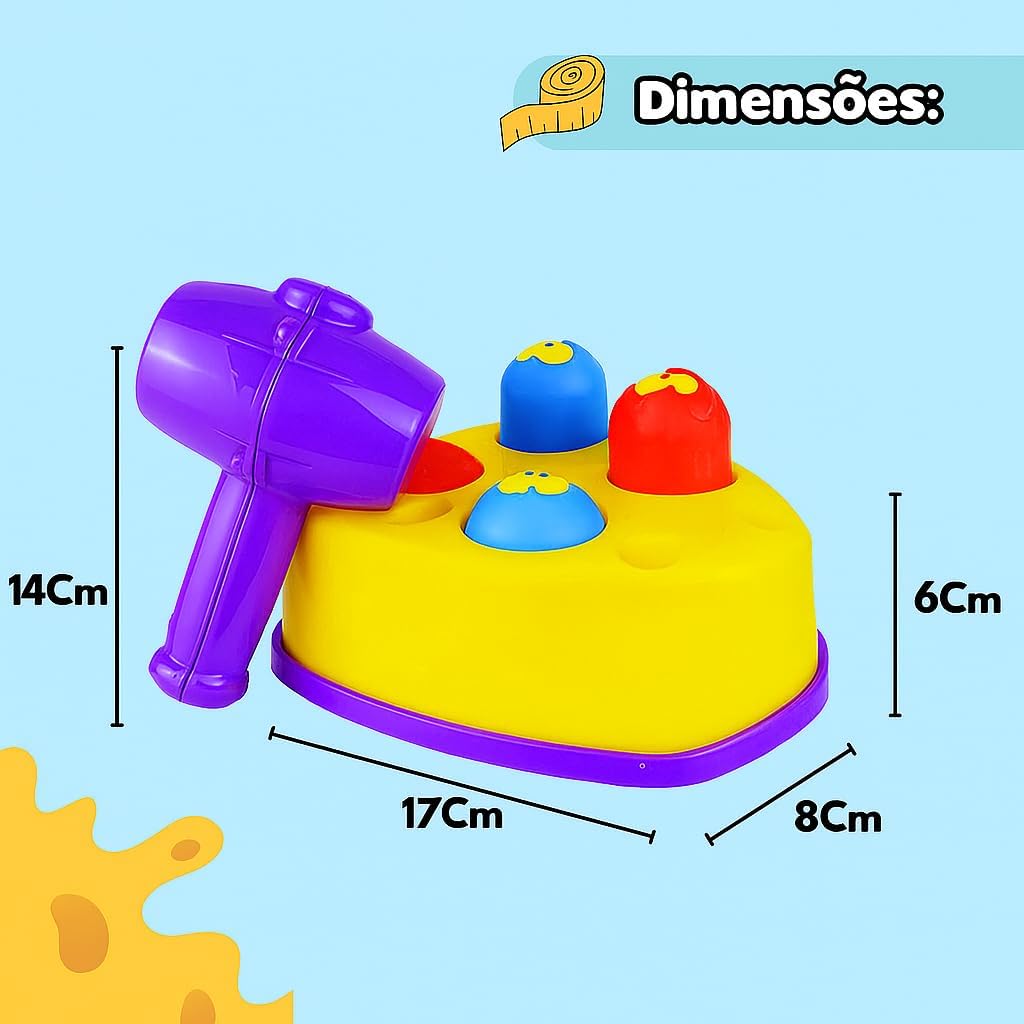 Dimensões: Comprimento: 17 cm, Largura: 8 cm, Altura: 6 cm, Martelo: 14 cm. Perfeito para levar em viagens, guardar em espaços pequenos e acompanhar a rotina da criança sem ocupar muito espaço.