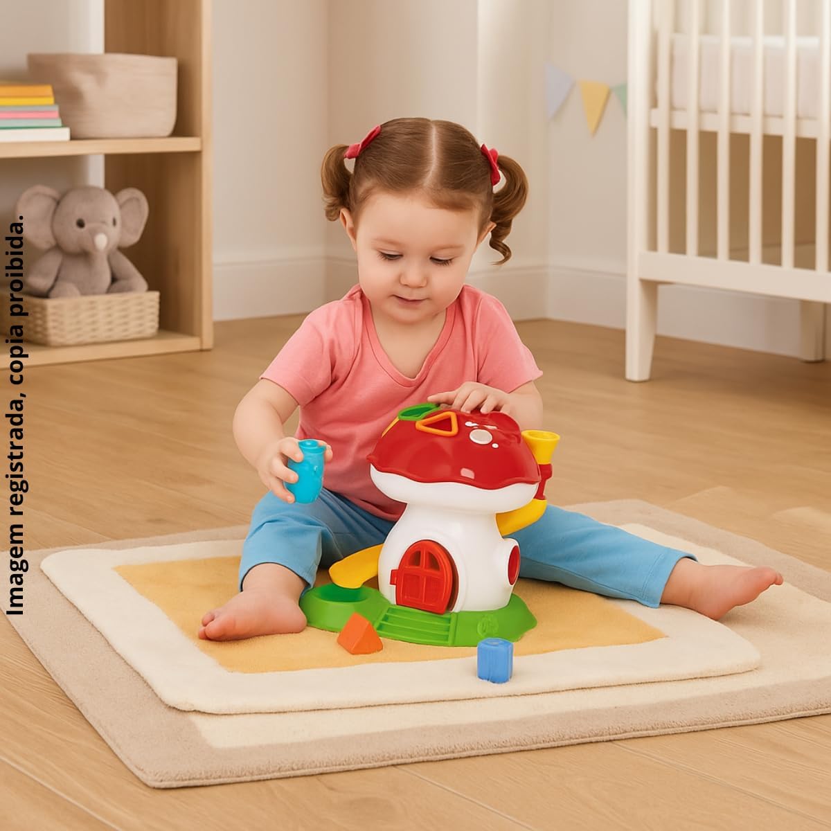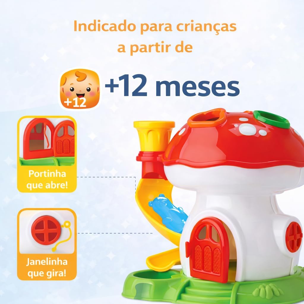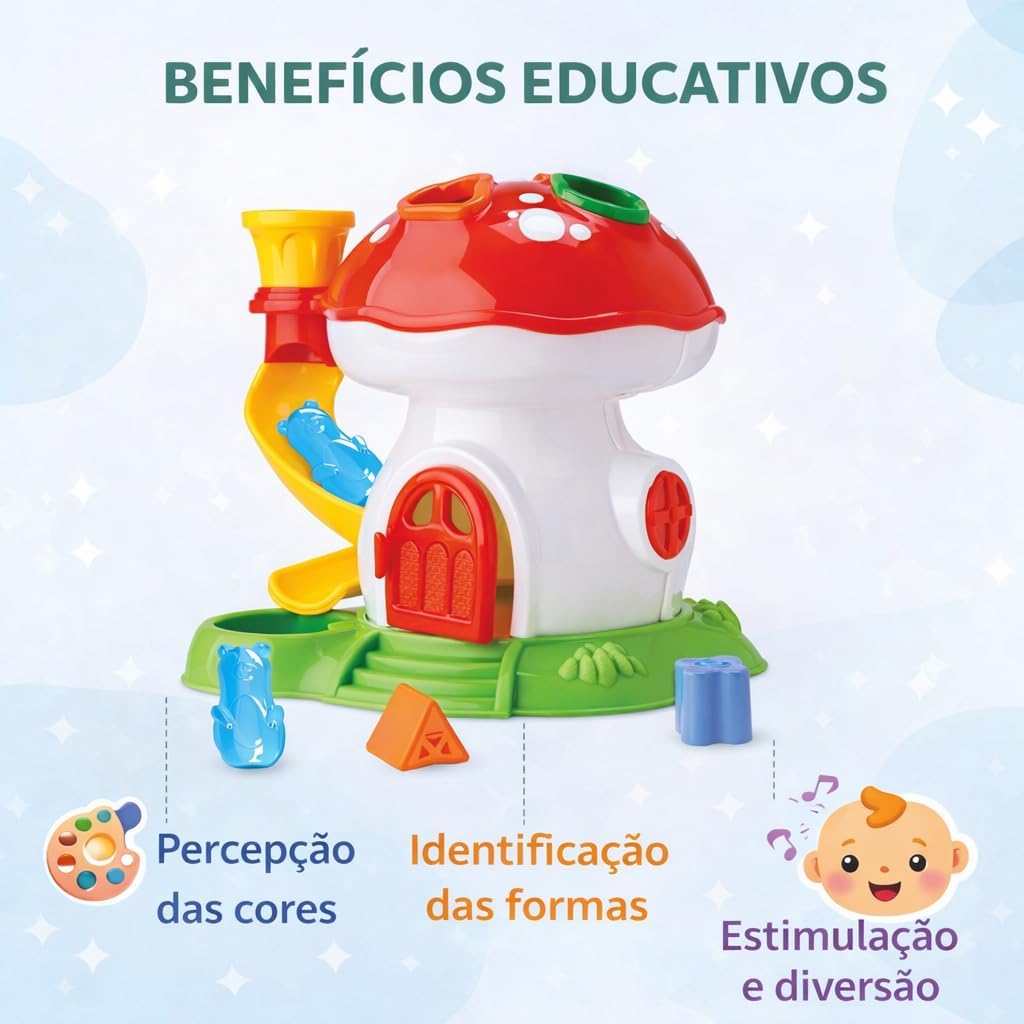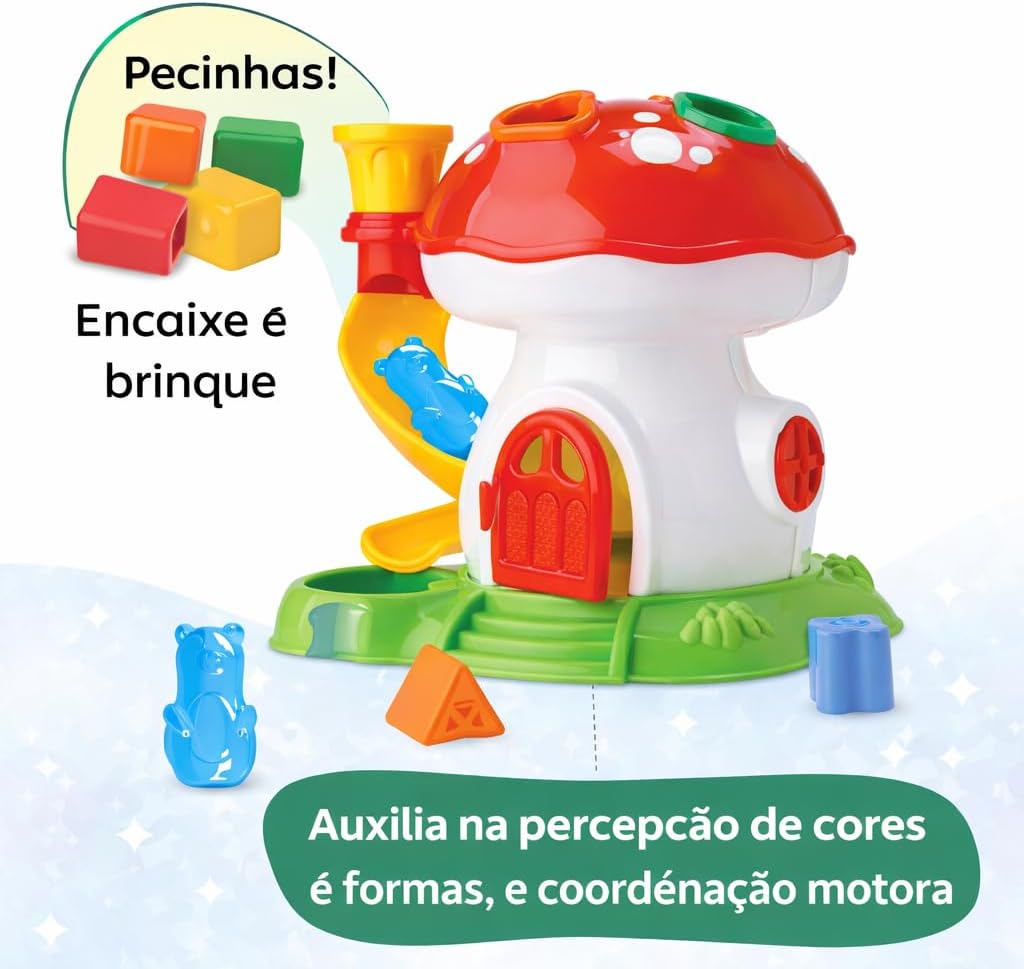 O Cogumelo Didático de Encaixe foi desenvolvido para estimular o desenvolvimento infantil de forma divertida e segura. Com peças coloridas, encaixes interativos e movimentos simples, ajuda a criança a explorar cores, formas e coordenação motora a partir dos 12 meses.