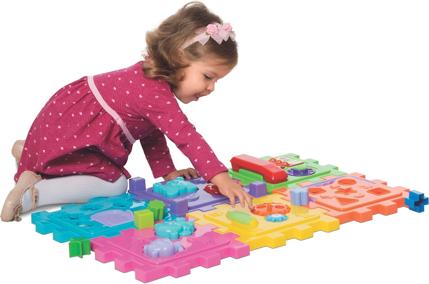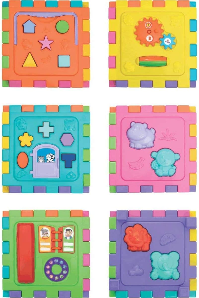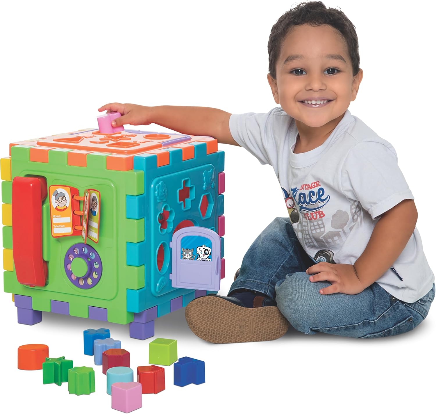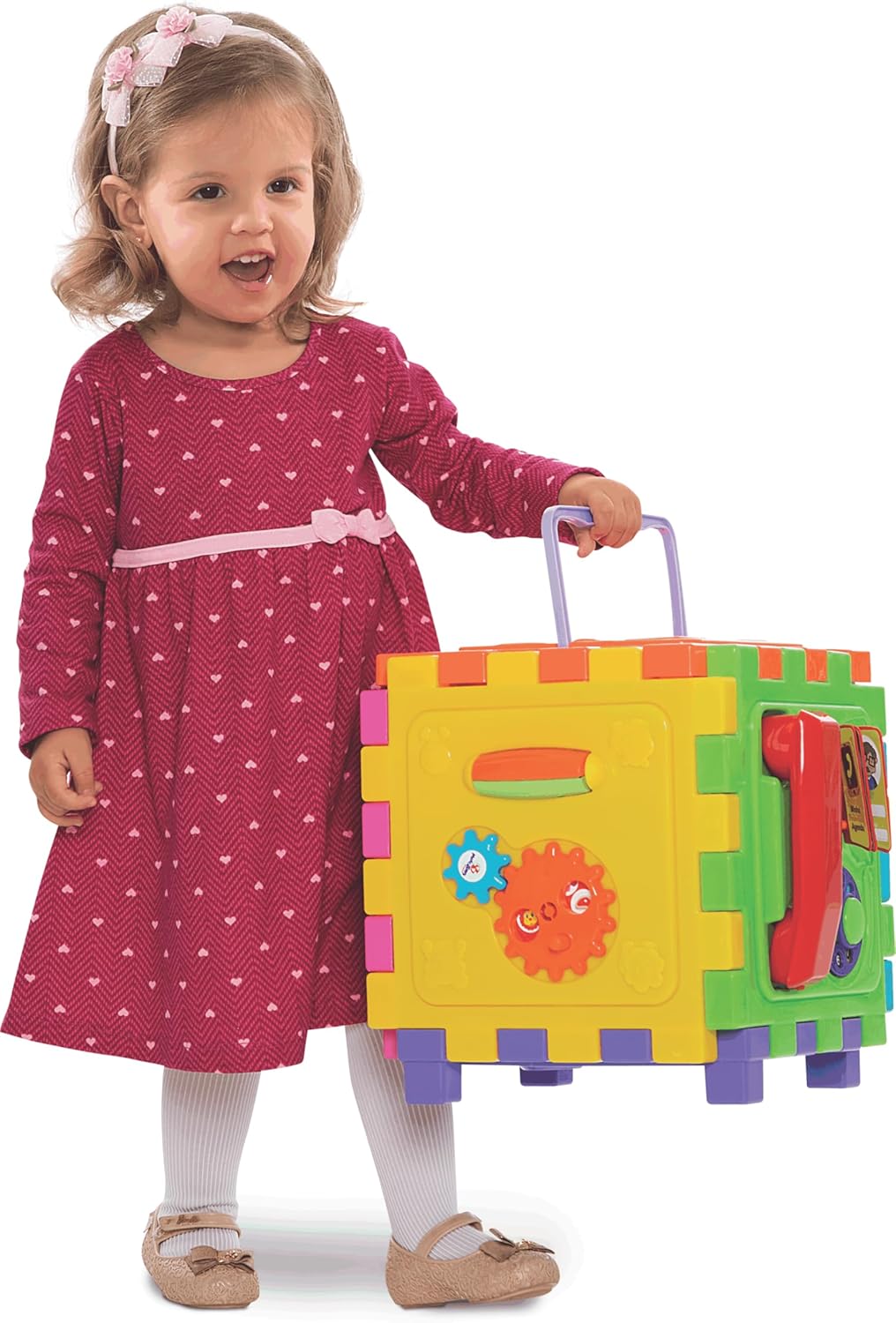 Fácil para montar e desmontar. Desmonte o cubo e monte ele aberto no chão para brincar com todos os lados ao mesmo tempo. Vira tapete, incentiva a percepção, o raciocínio lógico, estimula a memória, a coordenação motora e auxilia a distinguir formas e cores.Divertido e colorido Cubo Didático Grande. Muitas atividades em um só brinquedo. Cada face uma atividade: 1) 5 formas geométricas e alça para levar 2) 5 formas geometricas e portinha abre e fecha 3) Telefone com agenda para escrever e aprender os números de telefone da família 4) Engrenagem com animais e sua comida e rolinho girátorio 5) 1 puzzle hipopotamos com 1 puzzle macaco 6) 1 puzzle leão com 1 puzzle elefante.