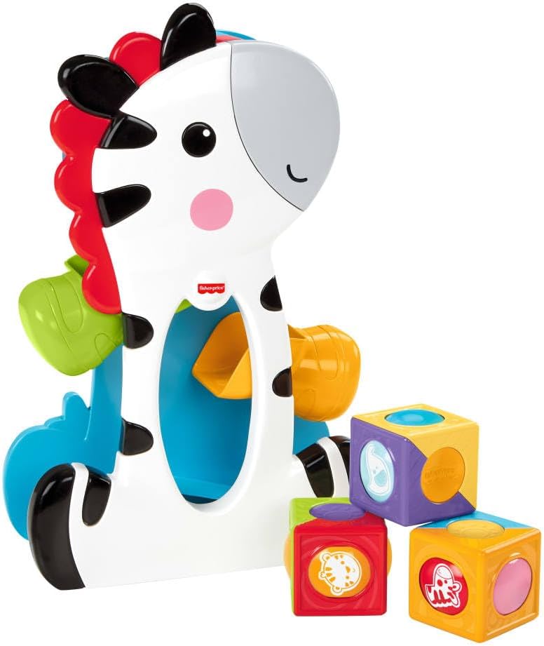 Versatilidade de brincadeiras com três blocos rolantes coloridos que podem ser empilhados na cabeça da zebra ou inseridos para cair por diferentes saídas.