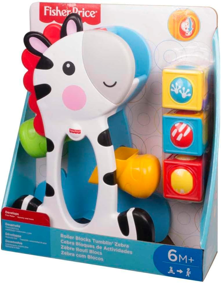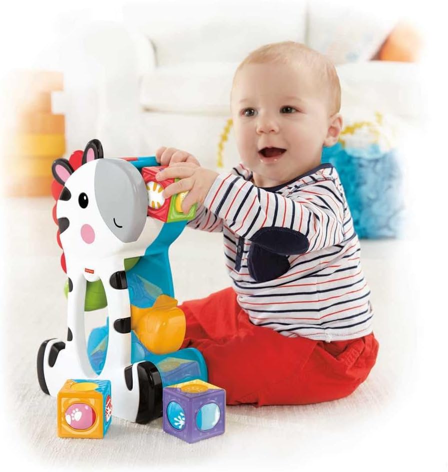 O Fisher-Price® Zebra Blocos Surpresa ganha vida com movimentos divertidos das mãos à medida que o bebê deixa os blocos rolantes caírem pela abertura no topo – e os vê caírem até o final! Qual pé eles sairão? Isso pode mudar a cada vez, mantendo o bebê atento! O bebê também pode empilhar os blocos rolantes na cabeça da zebra – ou apenas bater nos blocos para muita diversão giratória! Por oferecer tantas maneiras de entreter o bebê, essa zebra definitivamente merece suas listras!