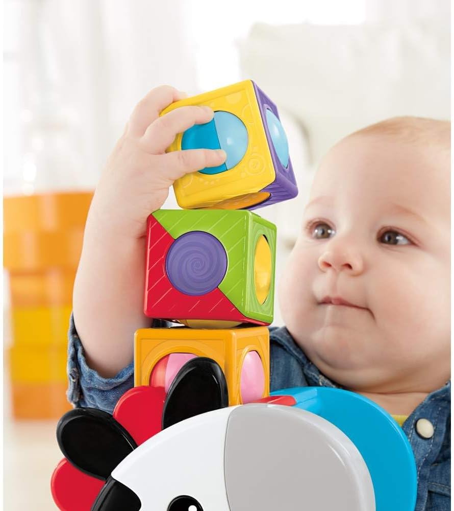 Brinquedo interativo em formato de zebra que desperta a curiosidade e o engajamento dos bebês com blocos coloridos que rolam e criam movimentos surpreendentes.