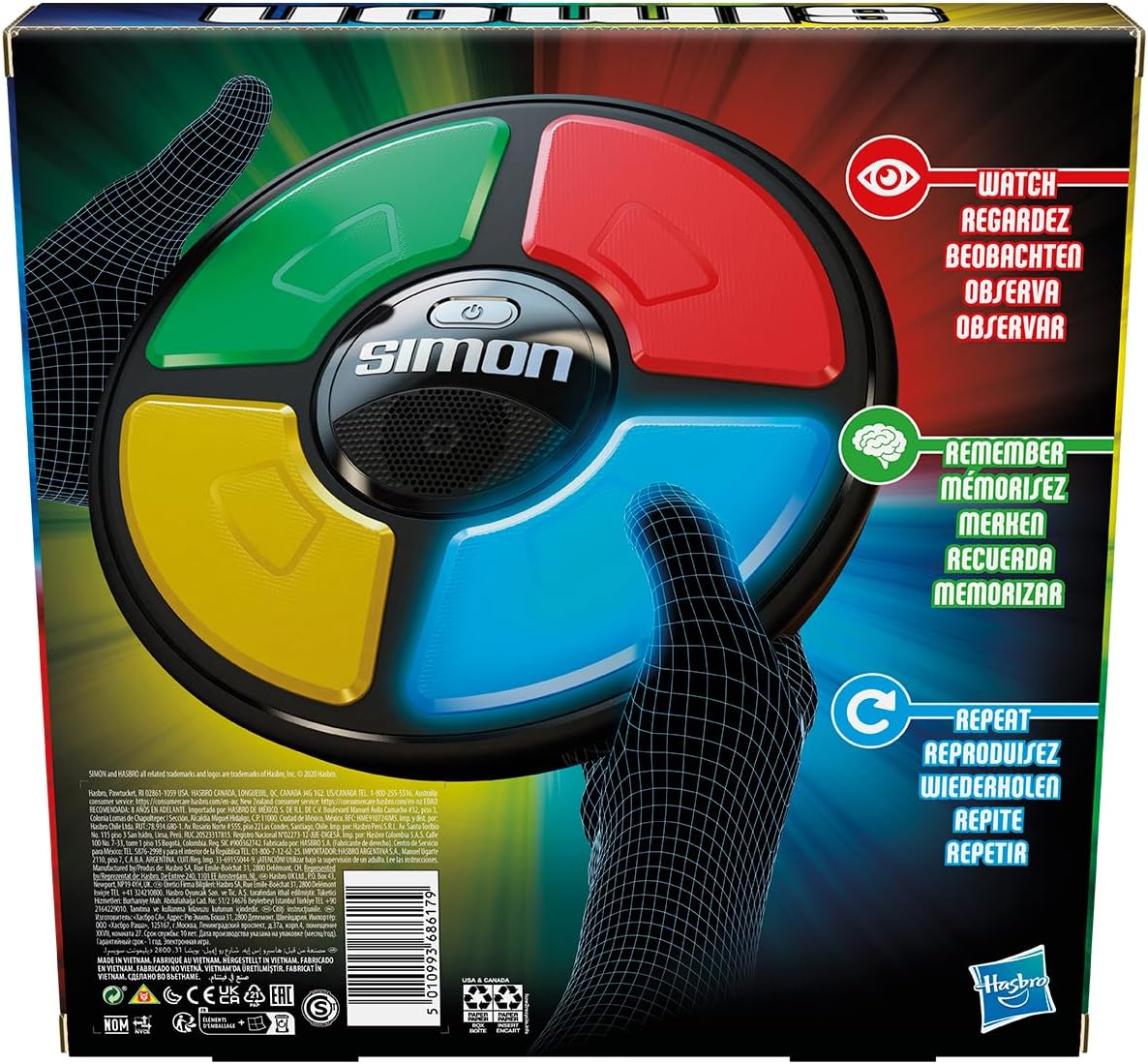 O jogo Simon traz de volta a clássica diversão eletrônica de luzes e sons em um formato portátil e envolvente.