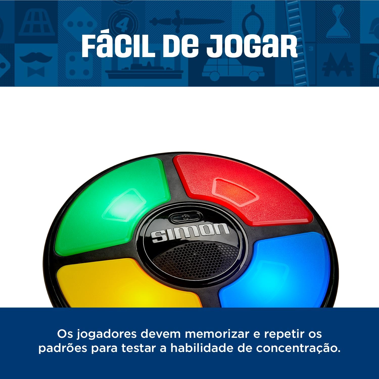 DETALHES DO BRINQUEDO. Inclui 1 unidade eletrônica portátil Simon com botões coloridos e sons característicos. Ideal para 1 jogador, acompanha partidas solo ou desafios entre amigos.