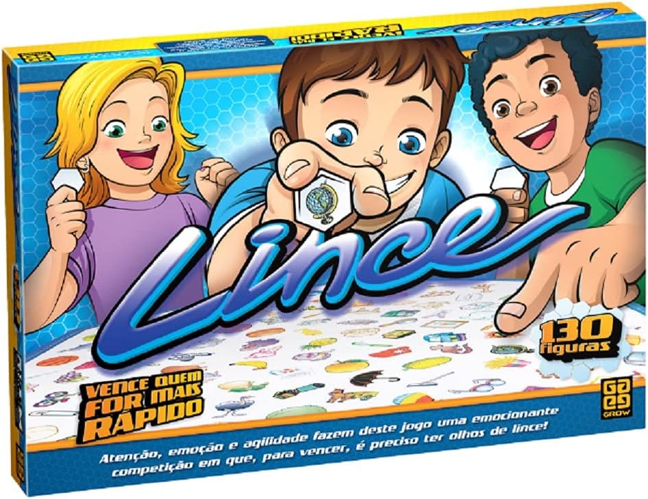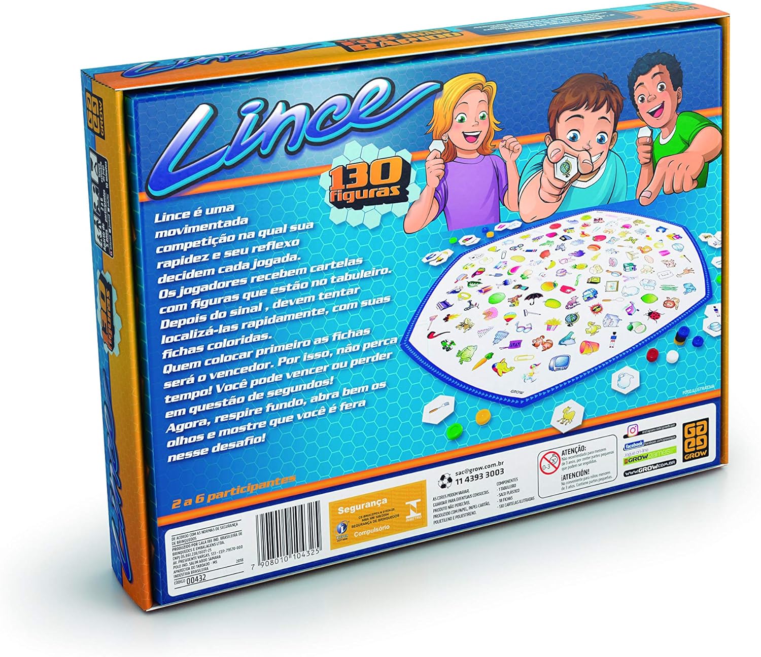 Lince é uma movimentada competição na qual sua rapidez e seu reflexo decidem cada jogada. Todos os jogadores recebem as cartelas com figuras que estão no tabuleiro. Depois do sinal, devem tentar localizá-las rapidamente, com suas fichas coloridas. Quem colocar primeiro as fichas será o vencedor. Por isso, não perca tempo! Você pode vencer ou perder em questão de segundos! Agora, respire fundo, abra bem os olhos e mostre que você é fera neste desafio!
