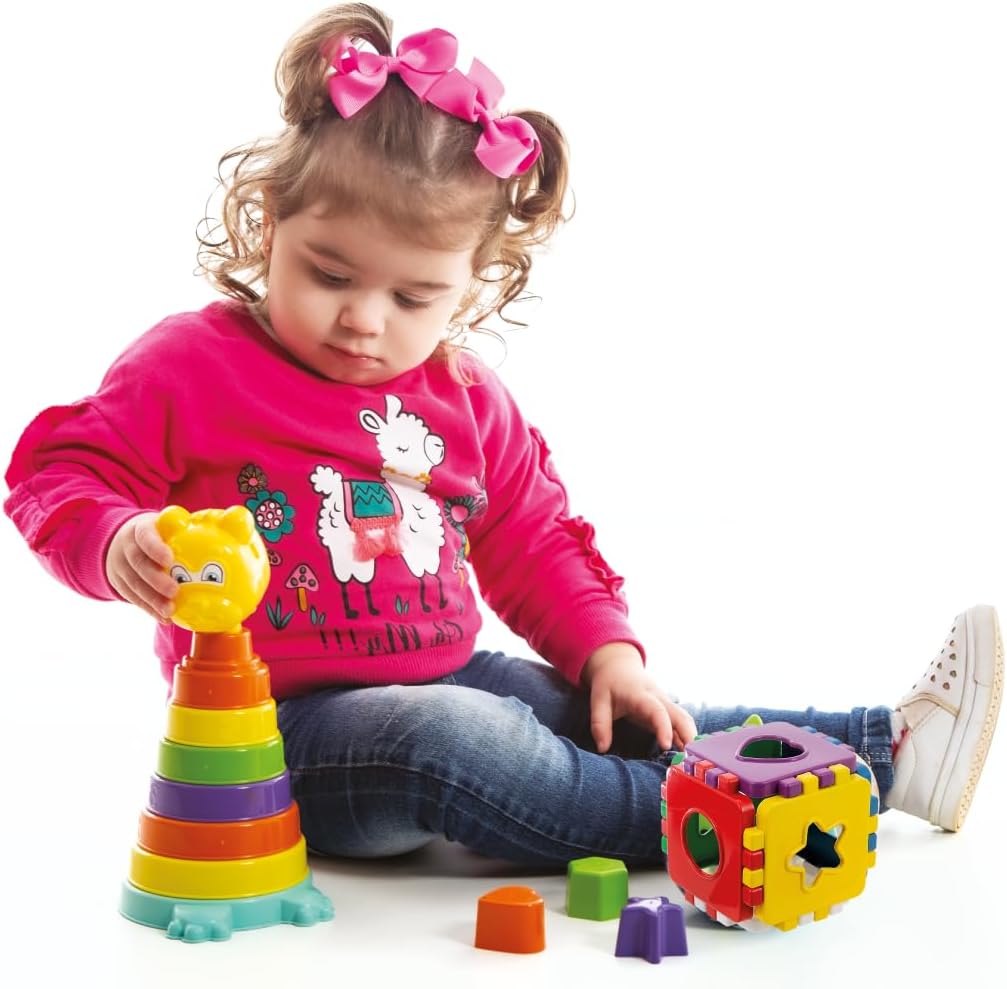 Mergulhe na Diversão com Nosso Ursinho e Cubo. Conheça nosso ursinho com 06 anéis coloridos para empilhar e um cubo cheio de surpresas, com 6 formas geométricas diferentes! É a combinação perfeita de aprendizado e brincadeira. Vamos tornar cada momento uma aventura divertida!