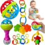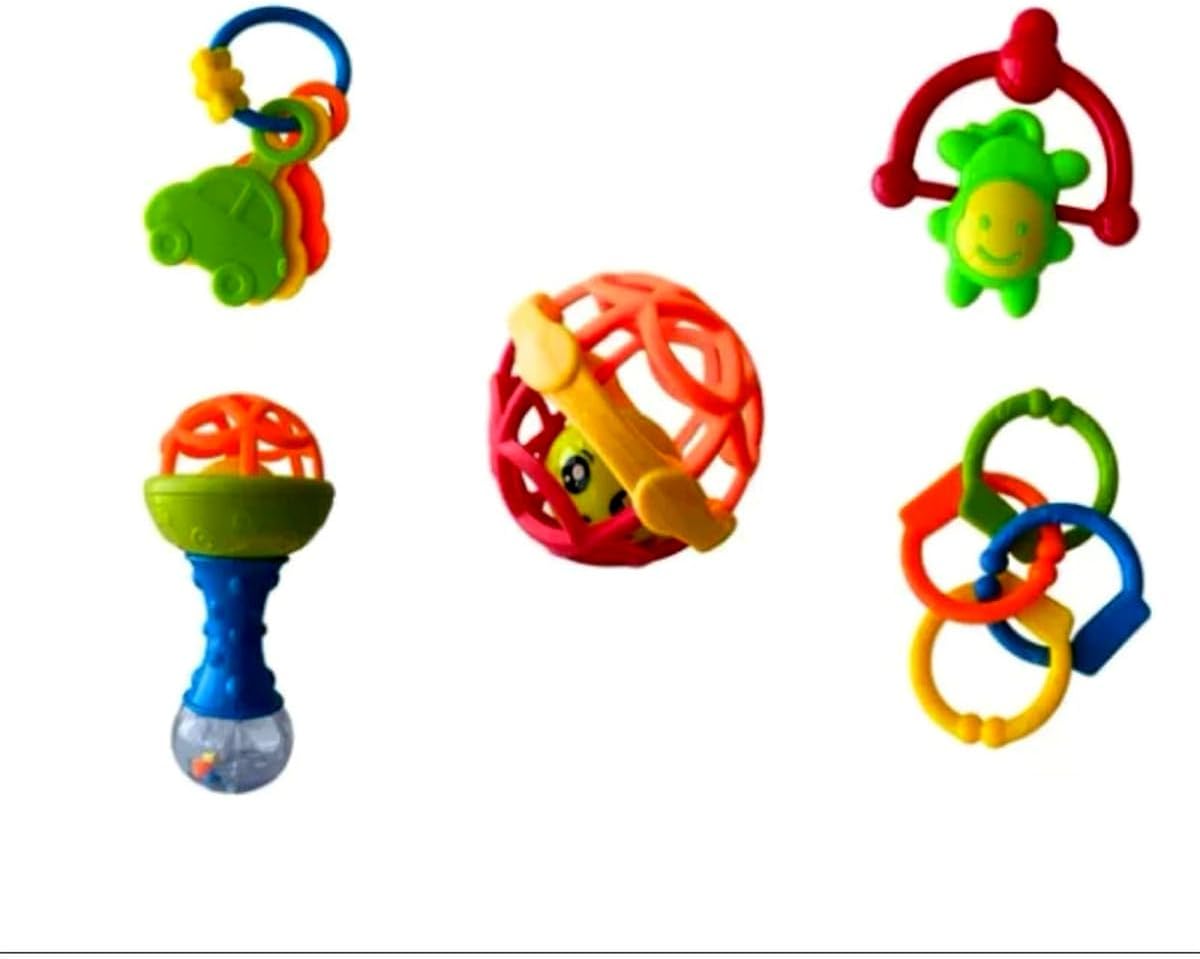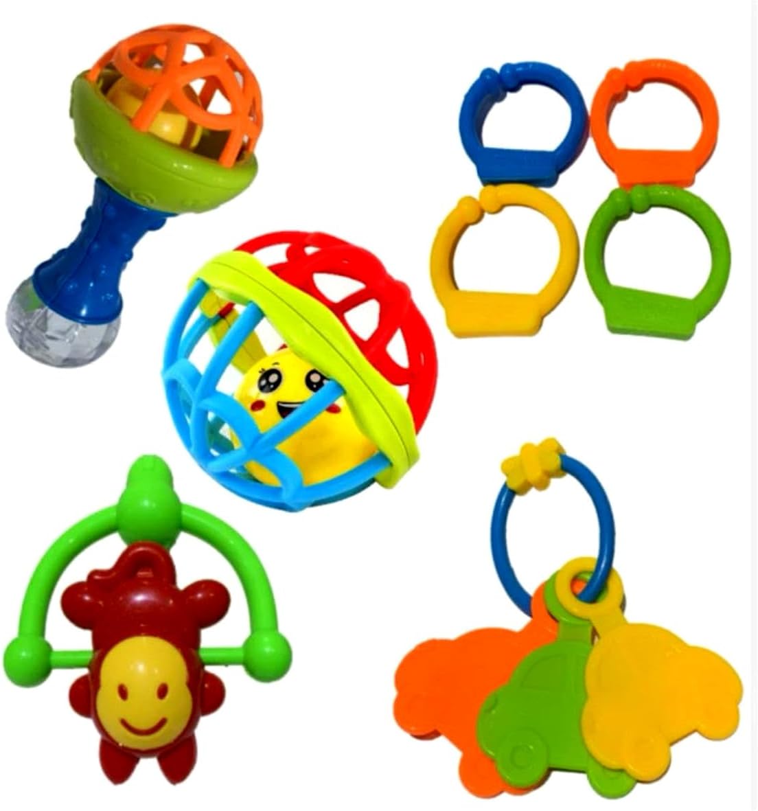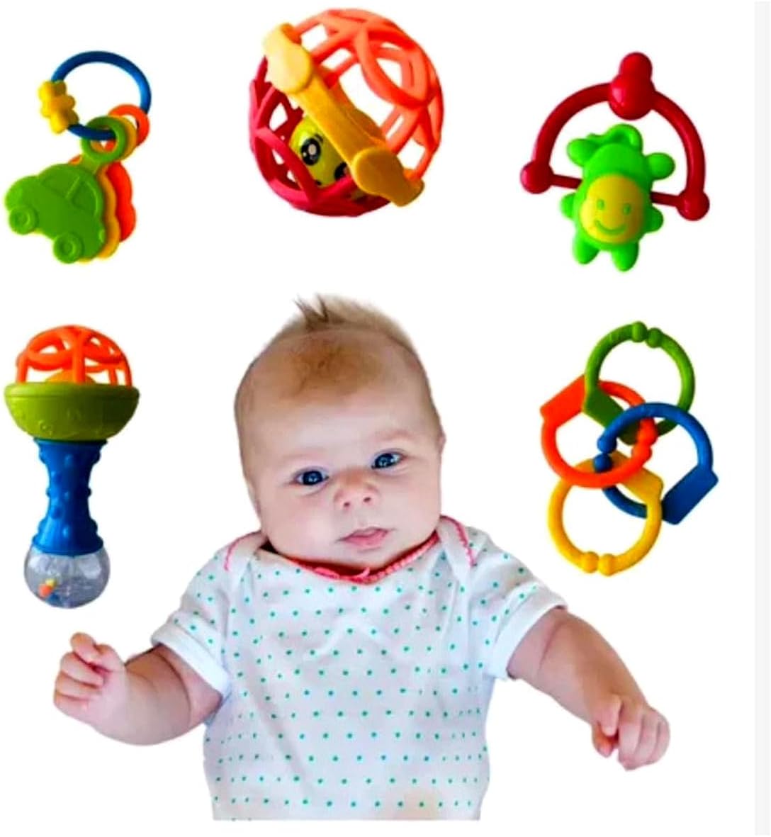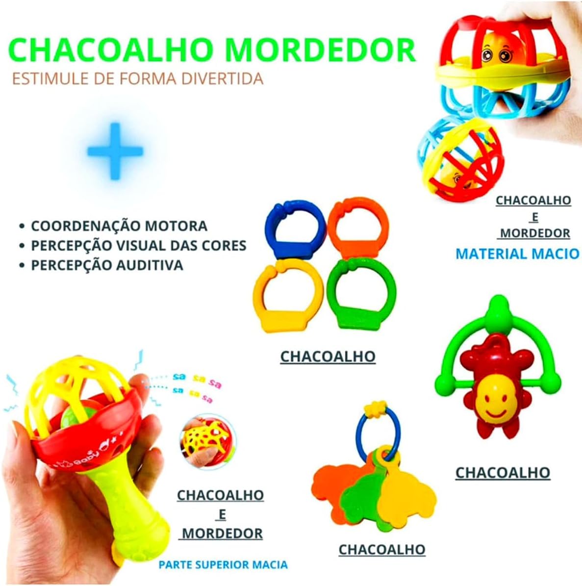 KIT COM 8 BRINQUEDOS SENSORIAIS: Conjunto completo com chocalhos e mordedores coloridos, ideal para estimular o bebê de forma divertida e segura desde os primeiros meses.