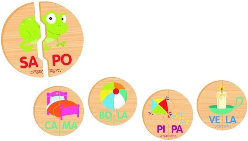 Nesse jogo a criança vai encaixar as peças e formar palavras com duas sílabas. Desenvolve a consciência fonológica e a percepção visual. São 40 peças grandes em madeira (8,5 x 8,5 cm montadas) com encaixes diferentes e ilustrações para guiar a criança.