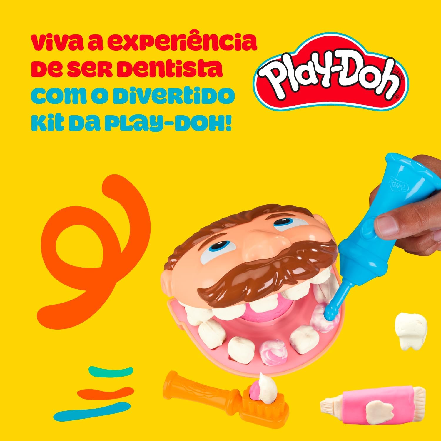 O clássico Brincando de Dentista Play-Doh chega em versão compacta para levar a diversão para qualquer lugar! Esse conjunto de massinha permite que as crianças em idade pré-escolar soltem a imaginação em uma consulta cheia de risadas e descobertas. O kit vem com moldes, escova, broca e massinha Play-Doh colorida, para que os pequenos possam criar e cuidar do paciente de forma divertida, aprendendo a importância da higiene bucal enquanto brincam. Dá para criar os dentes com o molde de massinha, colocá-los na boca do personagem, remover cáries com a broca e até “escovar” os dentes usando Play-Doh como pasta! É a união perfeita entre brinquedo criativo e educativo, que estimula habilidades motoras, coordenação e criatividade! Esse mini kit infantil é prático, portátil e fácil de guardar, ideal para levar em viagens, festas ou atividades em família. São 2 potes de massa de modelar Play-Doh de 56 g cada, que abrem um mundo de possibilidades de brincadeiras para crianças. A massa Play-Doh é atóxica e segura, perfeita para arte com massinha na escola, momentos de imaginação em casa ou até para estimular brincadeiras criativas de faz de conta. Porque com Play-Doh, toda criança descobre que brincar com massinha é mais do que diversão: é aprender, criar e reinventar cada detalhe com alegria!