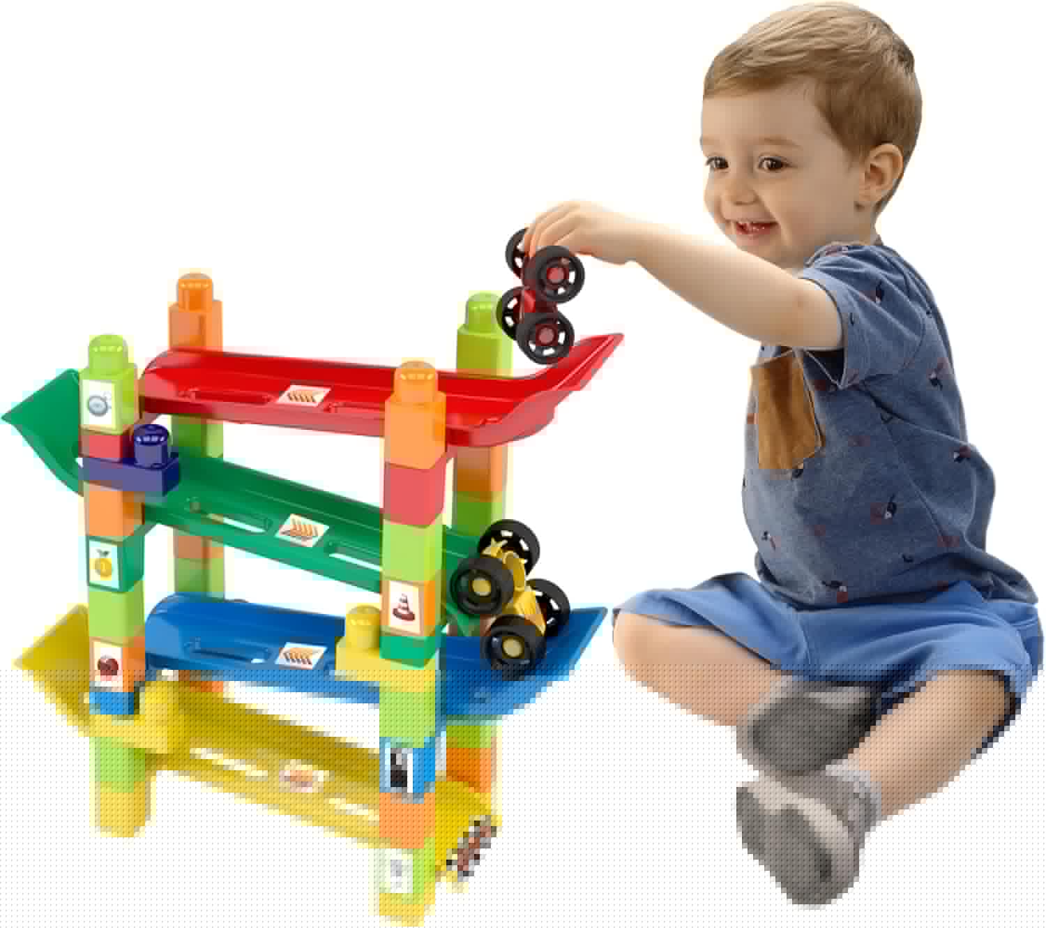 Rampa com blocos de montar e carrinhos. Possui montagem diversificada estimulando criatividade, inteligência, planejamento e organização. Melhora habilidades motoras como foco e concentração. Acompanha cartela de adesivos para deixar a brincadeira ainda mais divertida.